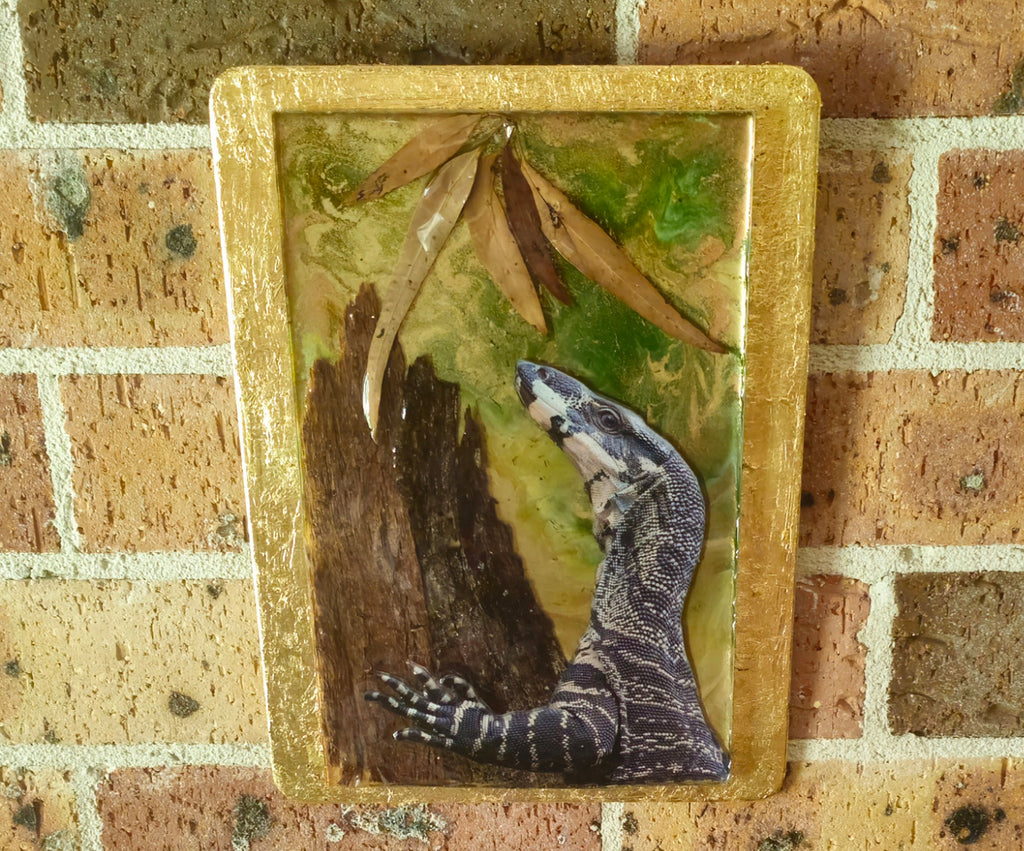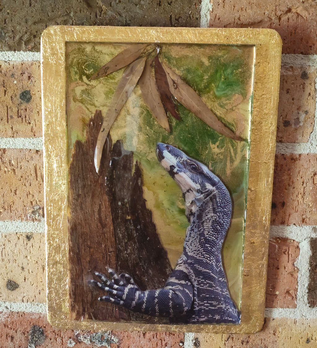 The Lace Monitor is from my photos and taken in the Blue Mountains, NSW. The photos, bark and leaves have been built up between four layers of resin to create a 3D effect. Gold leaf placed around the edges of the mount.