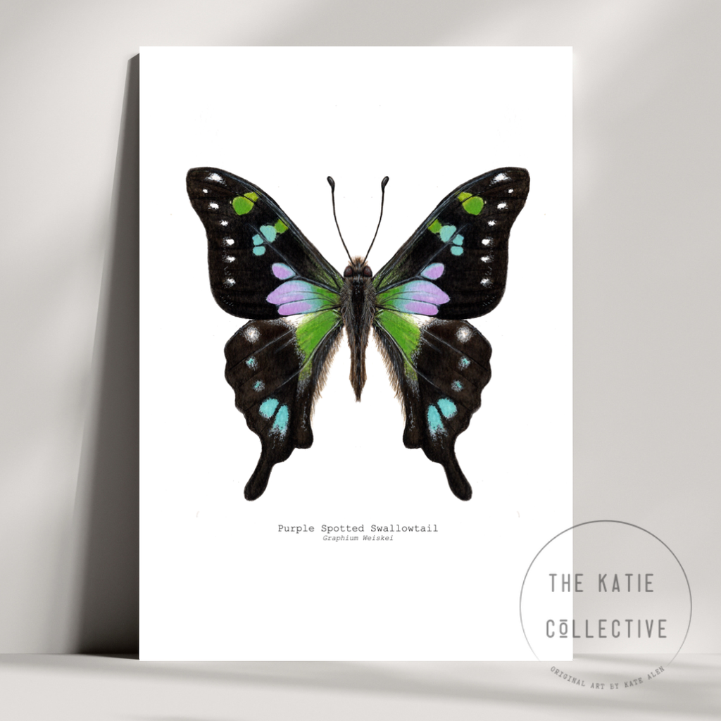 A hand-painted celebration of the Purple Spotted Swallowtail (Graphium Weiskei). This artwork captures the bright colours and delicate form that make this species so majestic. Only found in the highlands of New Guinea, the habitat where they live is actually extremely endangered; less than 6% of the forest is still standing.