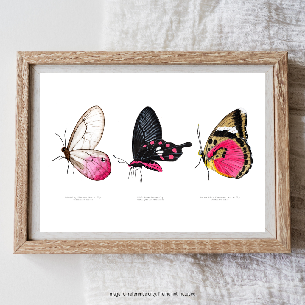 A hand-painted celebration of the soft, romantic beauty of pink butterflies. This artwork features three distinct butterfly species, carefully illustrated to highlight their delicate colour, pattern, and graceful form.