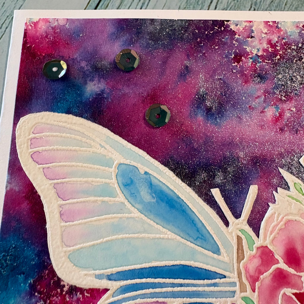 This one of a kind beautiful water coloured butterfly is set on a shimmery hand painted background made using exploding paint powders.