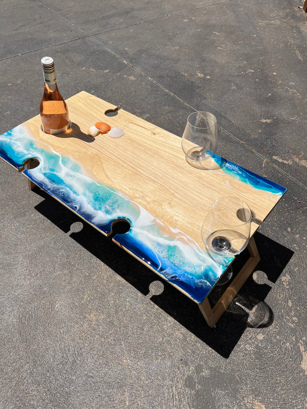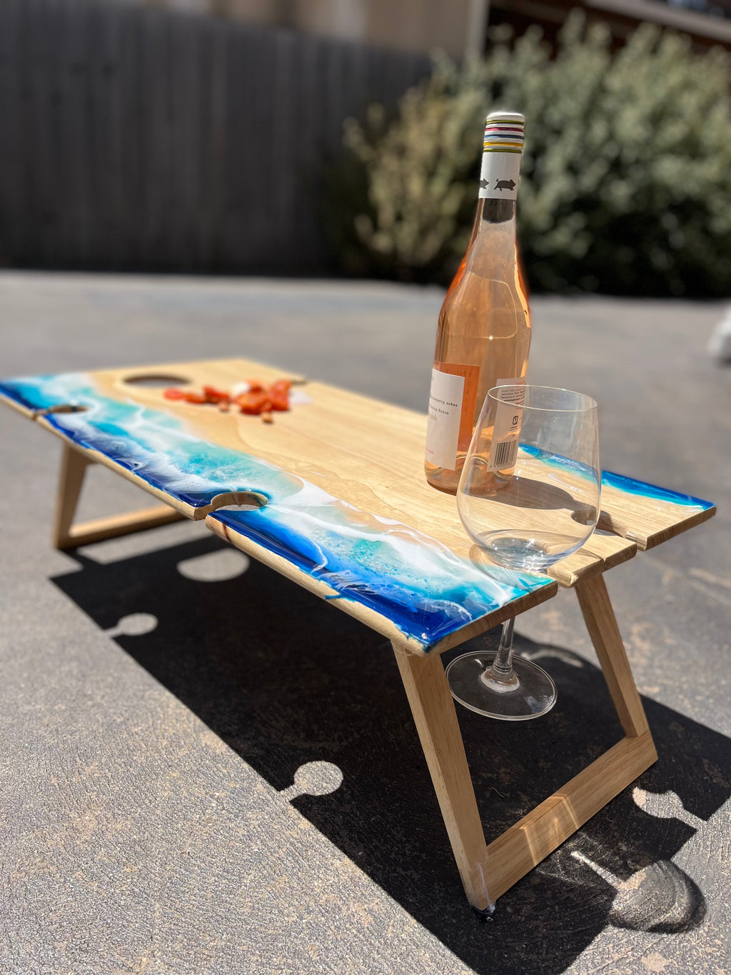 Lovely wooden folding picnic table board, with 4 wine glass nooks and wine bottle holder too!