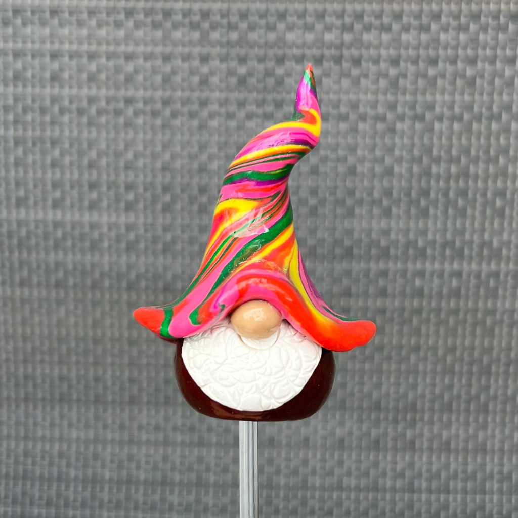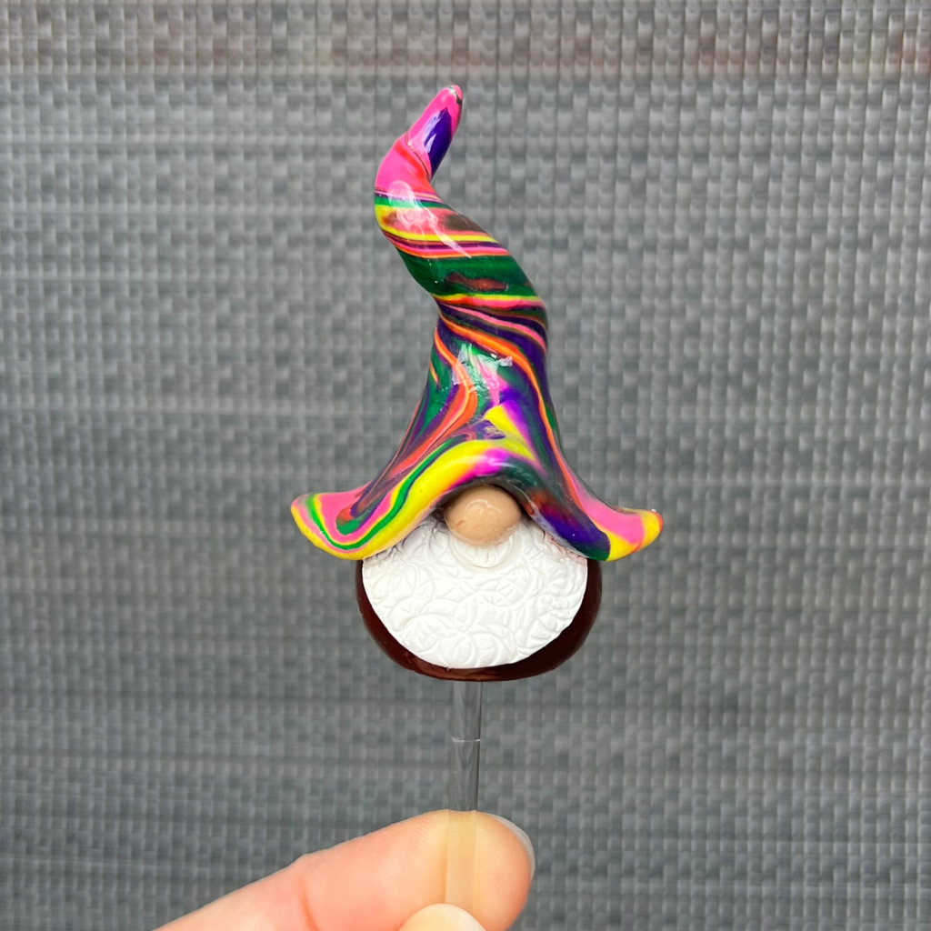 Handmade by me (Cass) on my back deck in East Gippsland, Victoria, each little fellow has a bottom of rich brown and a hat twisted with purples, oranges, yellows and greens. They are created from polymer clay and finished with a glossy UV-cured resin glaze to make their colours truly pop.