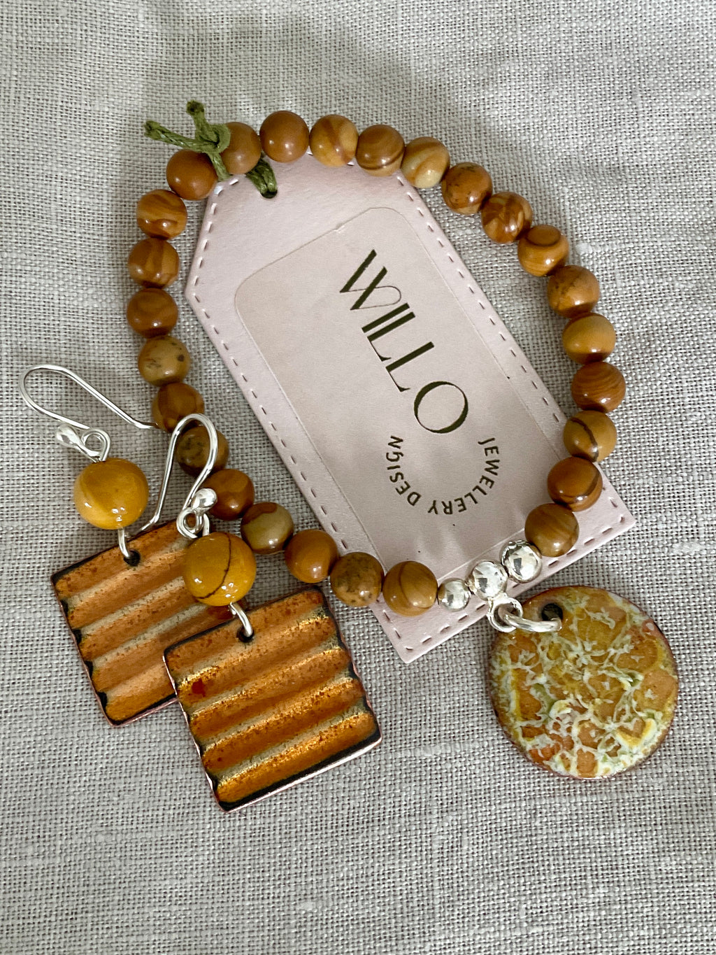 The enamel charm measures 2.2cm in diameter and the Wood Jasper gemstone beads measure 6mm