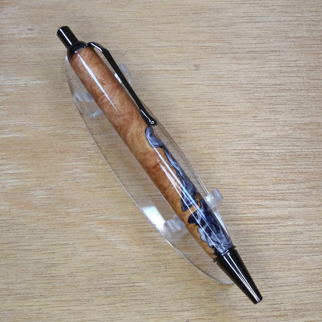 This pen is made using a Mallee Burl wood blank cast with a Black/Grey/White Swirl resin mix. Using the Dawn pen kit with Gunmetal fittings. With a click-click style action for nib extension or retraction makes for a very enjoyable writing experience. Ball point ink refill are readily available. As wood is a natural product , some movement may occur over time under certain conditions.