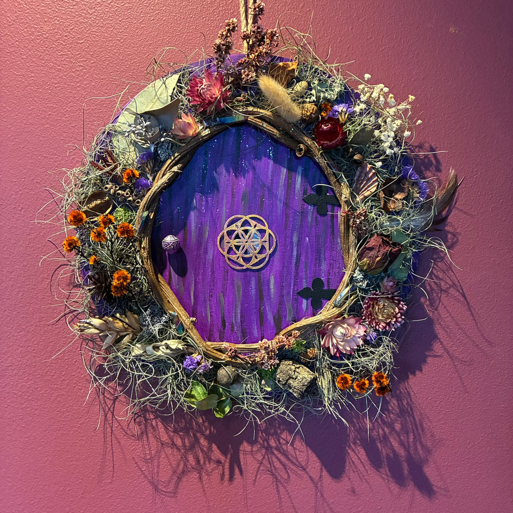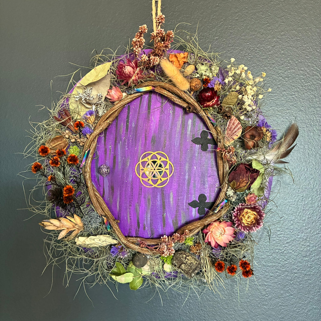 Hand Painted & Crafted with natural materials as well as repurposed items. These may include Dried Flowers, Seeds, Feathers, Crystals, Shells, Berries, Bark, Buttons & all manner of things.